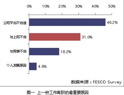 “员工因上司而走”,那么到底有多少员工是因为与上司的关系而离职呢?如图一所示,尽管原因可能会多种交错在一起,但让员工选出最重要的一项时,有31%的员工认为上一次离职的原因是与上司的关系问题,这一比例仅次于认为公司平台不适合这一选项。