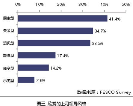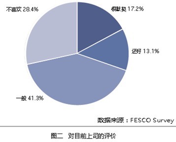 但是,通过数据我们仍然能够看出很多问题。首先,可以欣喜地看到,还是有17.2%的员工与上司配合默契,有如鱼得水的感觉,这些员工能够充分发挥出自身的能力;其次,员工越来越有独立性,希望上司不要过多地干涉自己,给予其充分的自由空间;再次,在心理上员工还是把上司看成前方的目标,目标正确自然能引导员工的方向,目标歪了就会被员工抛弃,这要求上司们以更高的标准要求自己,否则将远远地被信息接收渠道更广、独立性更强、潜在能量更大的下属抛在后面。