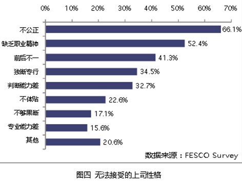 示范型的上司是最不受员工欢迎的类型。凡事以自己的为标准,制定规范,进行示范,并要求员工严格遵守,这样反而让员工反感。事必躬亲的上司不但把自己弄得很累,下属也感觉很痛苦,不懂得放权造成的结果就是费力不讨好。如果只是不合胃口,起码还可以忍受,让员工毅然说出不喜欢三个字的上司,一定有让员工不喜欢的原因。如图四所示,员工最无法忍受领导的“不公正”,当然这说明不公正,起码是感觉上的不公正已经落在了这名员工头上。紧随其后的问题是“缺乏职业精神”,员工还在努力工作,上司已经别有用心了,这样的上司只能换来员工的鄙视。员工意见比较大的几点还有前后不一、独断专行、判断能力差。其他性格上的缺陷,包括不体贴,不够果断,专业能力差虽然有员工提出,但选择人数较少,已经不是员工的关注点了。