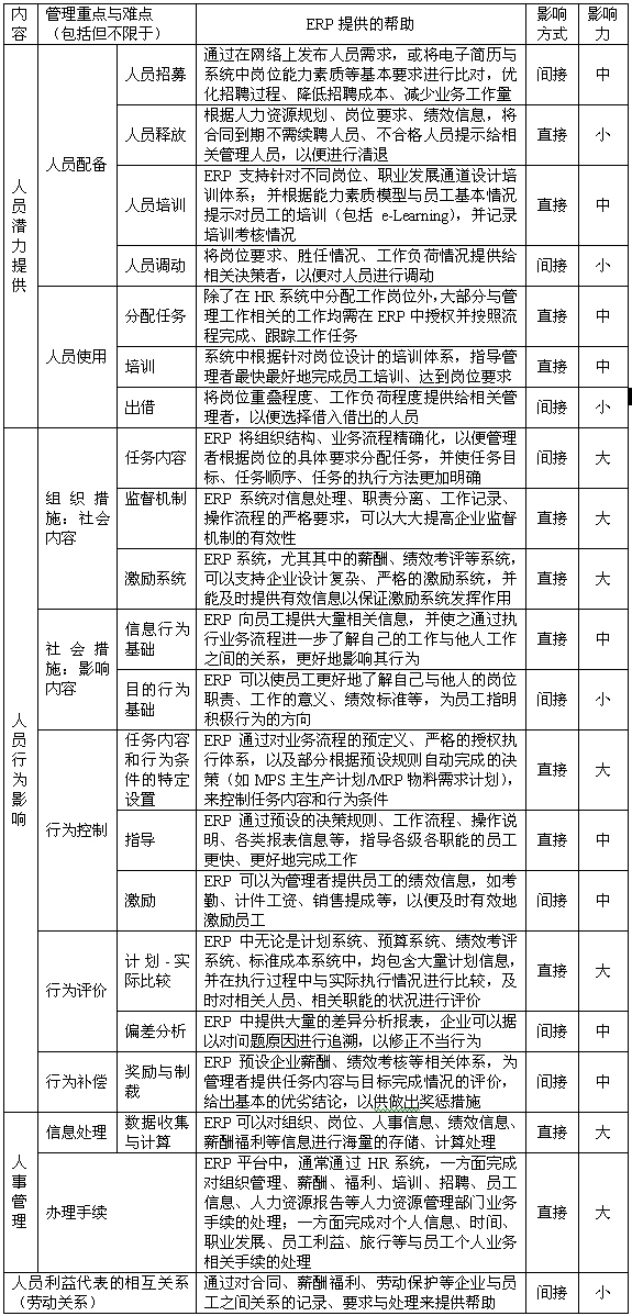 综合上述人力资源管理工作的内容与方法,可以将人力资源管理工作方法、人力资源管理的重点与难点、ERP为人力资源管理带来的帮助与改善,以及这些方法对人力资源管理、人员工作绩效的影响方式与影响力,列表描述如下: