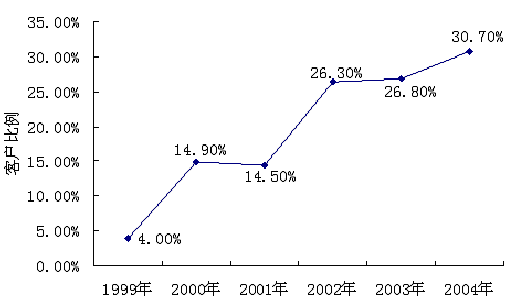 2003年,“非典”爆发对管理咨询市场产生了不小的影响,客户比例仅有0.5%的小幅提升,2004年,客户比例突破30%,达到30.7%,增幅达到3.9%,比2003年有了明显的增幅,但仍不及2002年11.8%的大幅度增幅。如图1-4。