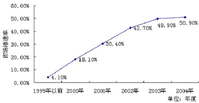 自1999年以来,管理咨询行业在国内逐渐兴起。到2004年,管理咨询市场渗透率达到50.9%,每年平均增幅为9.36%,如图1-2、1-3。