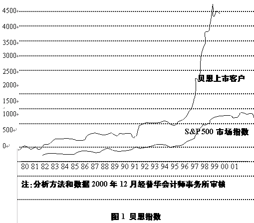 越来越多从事咨询业的人都发现,不能提供立即能够看到的成果已经成为咨询公司最容易受到攻击的点,即便是像麦肯锡这样历史悠久、声名卓著的公司也不能例外(如实达事件)。因此现在许多咨询公司都致力于为企业提供切切实实成果的服务,科尔尼顾问公司董事经理孟凡辰博士介绍了科尔尼最近在欧洲市场上拿的一个项目:当科尔尼说今后几年该项目会为客户省几十亿的资金,客户同意让科尔尼来做这个项目,但是客户要求科尔尼与其财务主管一起把这些省的钱分到具体的业务单元上去,并且科尔尼必须说服这些业务单元的主管,让他们做出承诺,分别签下契约。贝恩公司一直致力于为客户提供切实的成果,并且专门设立了“贝恩指数”,该指数以图表的形式反映顾客雇用贝恩公司后其股票的走势,与其他各种指数相对照(见图1)。