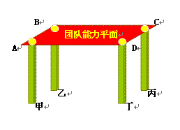 在上图中,假设我们对该团队实施标杆管理方法来促进其发展。那么我们首先从甲中提炼出他在团队中的最优点A ,树立单点高度,将其作为单点标杆;同理,分别从乙找出其在团队中的最优点B,从丙中找出C,从丁中找出D,分别将其树立为单点标杆。那么,就形成了一个标杆群,这个标杆群就支撑起我们整个团队的能力平面。(另外注意一点,不仅要在团队内部建立标杆,更要从团队外部寻找标杆。这样整个标杆管理的杆群效应才能最大的发挥和体现出来。)