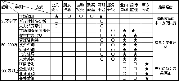 对于中大型的咨询服务,服务时间较长,质量和专业经验将是企业考虑的最重要因素,而专业经验需要长期积累、研发、沉淀,而且每家咨询公司专长都有所侧重,所以我们不主张依靠关系、被动接受等方式;对于服务升级和全面外包是很多咨询公司推广方式,正如前所述,咨询公司自身专业积累不是在很短时间内能够完成升级的;我们推荐采用业内口碑和招标监理这两种方式。