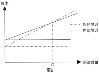 从图2中可知,内部培训由于要搜集培训资料、购置相应设施、聘请专业人员等费用支出,所以其固定成本是高于外包模式。培训外包,企业只需投入少量的资金就可以分享专业培训公司全面开放的专业培训经验,从而大大节约培训管理的成本,但随着企业规模的扩大,企业培训人次逐渐增多,相应地员工培训费用也将上升。图2中Q点是规模效应的转折点。可见,培训外包活动较为适合中小型企业。