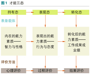 才能三态论明确界定了才能在不同状态下的不同表象载体。才能的“持有态”是指人内在的能力素质,以智力和性格作为其表象载体;“表现态”是指人在社会实践中表现或发挥出来的能力素质,其表象载体是人的行为;“转化态”是指人发挥出的能力素质所转化的状况,工作结果或业绩是其表象载体。