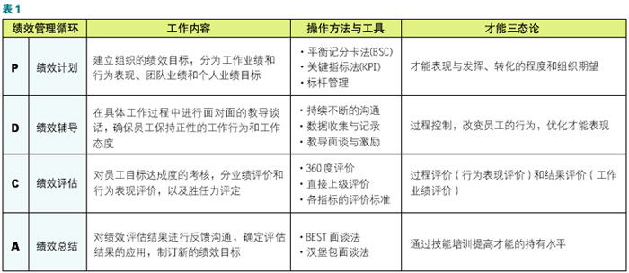 由于传统意义上的绩效考核局限于绩效评估这一环节,但从才能三态论来看,人的才能最终要表现为他的工作业绩才能给企业带来更高的绩效,因此,绩效管理循环与才能三态论的关系可用表1来表示。