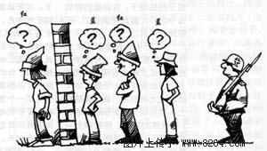 请你们把自己想象成战俘集中营里的战俘。集中营的司令让你们四个人站成一排,并给每人戴一顶帽子。他不许你们移动、回头和说话。如果有人胆敢回头或说话,就会立刻被枪决。现在。请你们闭上眼睛,把帽子从袋子里拿出来,戴在头上。在这个过程中,任何人都不许看自己的帽子。司令让你们猜出自己所戴帽子的颜色,如果你们4个人中有人能说对自己所戴帽子的颜色,你们4个人都会被释放。但是,如果第一个答案是错误的,你们都会被枪决。显然,第一个答案将决定你们的命运。一个重要的已知条件是4项帽子中两顶是红的。两顶是蓝的。别忘了。不可以说话、走动和回头。