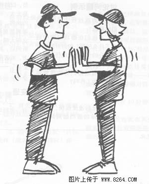 3.两人都伸出胳膊,四掌相对。整个游戏过程中,不允许接触搭档的其他部位。