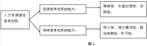 战略性人力资源管理是以对人力资源战略价值高度重视作为价值观,依托企业战略目标而进行的一系列对人力资源管理活动有纲领性指导作用的战略规划,它是企业通过人力资源来获得持续竞争优势的一种战略性管理过程。与传统的人事管理相比较,依靠企业核心人力资源去建立竞争优势和依靠员工实现战略目标,是战略性人力资源管理的基本特征。人力资源这一战略资源所具有的潜在的竞争优势如图1来表示: