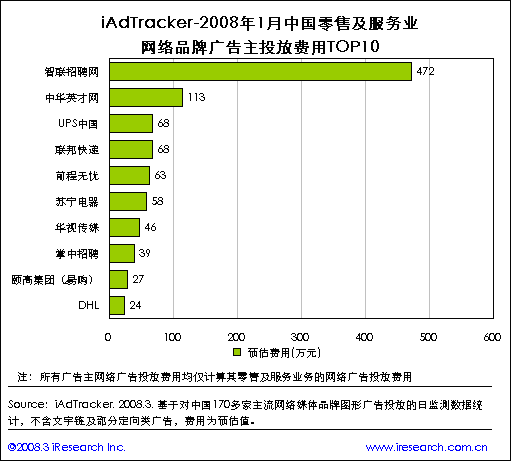 艾瑞分析认为,智联招聘在用户覆盖人数排名居首的原因除了其网站内容建设较好以外,大规模的广告投放也成为了重要的推动力。iResearch艾瑞咨询结合网络广告监测系统iAdTracker的最新数据研究发现,智联招聘1月份用于互联网品牌广告的推广费用约472万元,是第二位中华英才网的4倍。