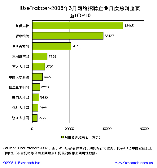 根据iResearch艾瑞咨询网民连续用户行为研究系统iUserTracker最新数据,2008年3月招聘类网站月度浏览量排名TOP10的网络招聘企业中,综合类网站的总访问页面量占82%,前三位的分别是前程无忧、智联招聘和中华英才网,三大招聘网站的流量优势相当明显。其中又以前程无忧的表现最为突出,其访问量占网络招聘行业总访问页面量的28%.