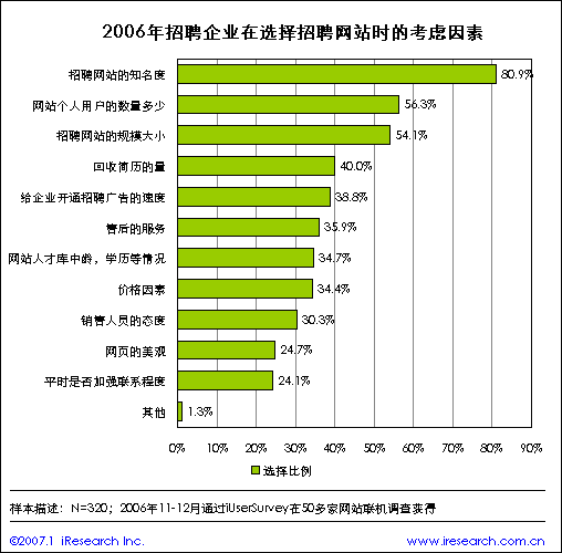 iResearch艾瑞市场咨询最新发布的《2006年中国网上招聘市场研究报告》显示,企业主在选择网络招聘网站时,知名度高成为雇主首选因素,占80.9%. 此外,网络招聘网站规模、简历数量和服务等企业雇主考虑比重也占35%以上,相比招聘企业的服务,企业雇主在选择招聘服务是考虑价格因素较低。