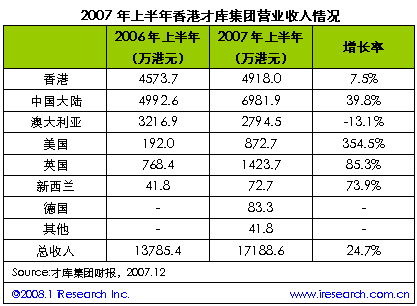 iResearch艾瑞咨询公司根据香港才库集团发布的财报整理显示,2007年上半年香港才库集团总收入达到17188.6万港元,环比增长24.7%,其中,中国大陆地区营业收入占整体收入比重最高且增长也较快,环比增长达39.8%,此外,才库集团在美国、英国和新西兰地区的营业收入环比都有较大增幅。
