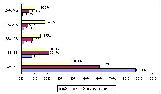 2) 中层管理人员:除了少数企业中层换血频繁以外,绝大部分企业的中层管理人员稳定性非常高。中层管理人员流动率在10%以内的企业近90%;流动率为10%-20%的企业占5%。