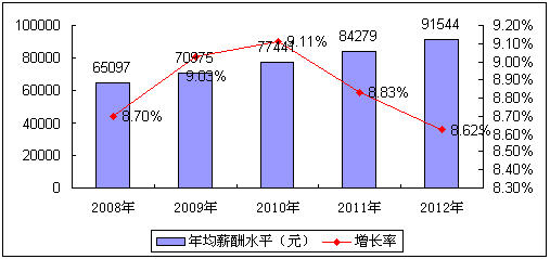图4 2008-2012年动漫行业年均薪酬水平及涨幅预测