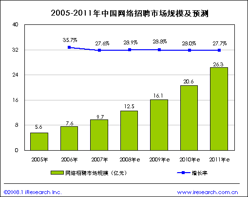 根据艾瑞最新发布的报告显示,2008年中国网络招聘市场规模将达到12.5亿元,比2007年增长28.9%,预计到2010年该市场将突破26亿元。从2002年开始中国网络招聘就进入快速成长期,网站数量不断增长,企业规模迅速扩大,国外公司也更多关注该市场。从该市场的发展特点来看,三大招聘网站依然占据一定的优势,但是行业和地方网站呈现出跳跃式发展的态势。
