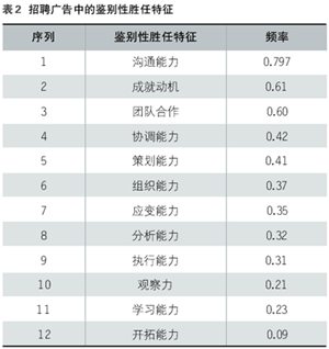 5.定性特征要求:值得注意的是,几乎所有的招聘信息样本中,都对销售经理的一些胜任特征进行了定性的语言描述,也就是基于内在素质的鉴别性胜任特征,在此笔者对这些特征要求做出了统计(如表2所示)。