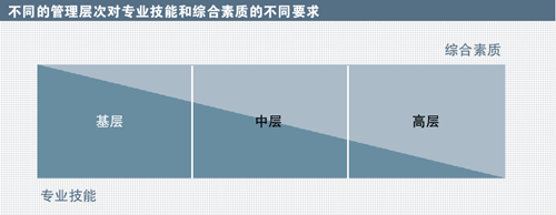 需要说明的一点是:对于管理人员,层级越高,对其专业能力的要求就相对越低,因为他可以用其他专业人员协助自己的工作。但是管理人员要把事情做大,一定要通过团队管理,这就需要管理人员具备良好的自我认知、领导、激励等综合素质。
