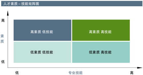 总的来说,可以通过素质和技能两个维度构成一个人才素质-技能矩阵,将人分成四类(见图1):第一类是素质非常高,技能也非常高的,但这种人很少,且每个公司都想要;还有一种是两者都很差的,这样的人大家肯定都不想要;大多数属于另外两类人:素质高但技能不是很高,或者技能非常高但素质不是很高。我们的倾向是选择素质相对比较高,而技能不是很高的人。这方面有很多具体案例,如蒙牛集团用人的时候就非常重视“德”的重要性。牛根生将蒙牛用人原则总结为四句话:“有德有才,破格重用;有德无才,培养使用;无德有才,限制使用;无德无才,坚决不用。”蒙牛只用了六年的时间,经济效益就增长了292倍,靠的是什么?牛根生说:“小胜靠智、大胜靠德。”德是一个人的立身之本、立业之基,正所谓“有德言乃立,无求品自高。”“其身正,不令而行,其身不正,虽令不从。”“德”、“才”是中国人常用的两个词,也对应了素质和技能的关系。
