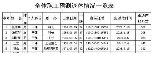 2:某企业进行职工退休预测,根据国家政策规定,男年满60周岁、女年满55周岁的干部,男年满55周岁、女年满50周岁的工人退休,欲打印全体职工的应退休时间明细台帐。