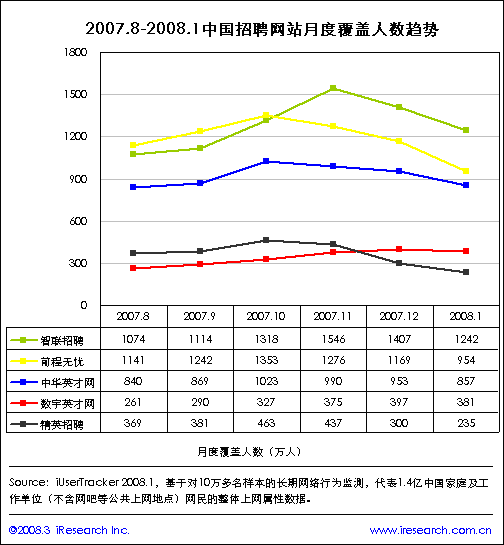 根据iResearch艾瑞咨询网民连续用户行为研究系统iUserTracker最新数据,2007年11月网络招聘高峰期过后,前三大招聘网站在2007年12月到2008年1月期间都有所下降,2008年1月招聘类网站总覆盖人数为3518.3万人,环比下降8.4%.其中,智联招聘以1242万人居首位,前程无忧954万人位居第二。排名三至五名的网站分别为中华英才网、数字英才网和精英招聘。