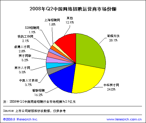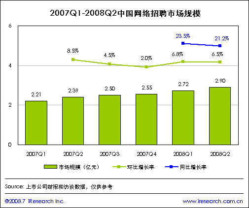 根据艾瑞咨询近期推出的《2008年第二季度中国网络招聘市场监测报告》显示,2008年Q2中国网络招聘行业市场规模同比增长21.2%,环比增长6.5%,达到2.9亿元。