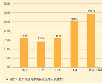 至余德国企业是否顺利达成自己在中国设定的目标,受访企业的回复不尽相同。11% 的企业表示已达成甚至超越其设定目标,36% 则表示连目标的一半都还没达到。由余本问题是以公司本身订定的目标为准,因此这 36% 的企业可能是野心太大,也可能是对中国市场的期望太过乐观所致。而投资中国多久后才能回收成本,受访企业情况也各异。