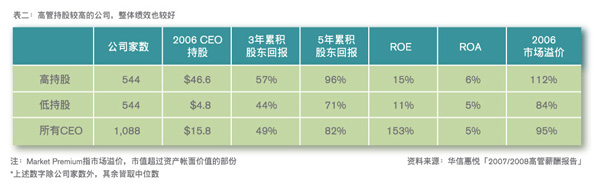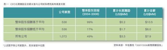 华信惠悦《2007/2008高管薪酬报告》(Report on Executive Pay)中指出,S&P 1500公司中,整体股东回报(Total Return to Shareholders)高于平均的企业之CEO的全薪,比整体股东回报低于平均的企业之CEO的全薪的企业数量高出75%,长期激励更高出300%。显见CEO奖酬水平与公司财务绩效高度相关(見表一)。