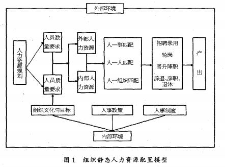 对于人力资源配置的定义,理论界并没有达成共识。从组织管理的微观角度来看,所谓人力资源配置就是通过考核、选拔、录用和培训,把符合组织价值观和发展需要的人才及时、合理的安排在所需要的岗位上,形成一定的结构效应,并使之与其他经济资源相结合,使得人尽其才,提高人力资源利用率,最大限度的为组织创造更多效益。根据这样的定义,人力资源配置包括人力资源初始配置及再配置两个部分,初始配置是指组织从外部吸纳人员的招聘活动,再配置则是指在组织内部进行的晋升、降职、轮岗及其与它们相关的一系列活动。