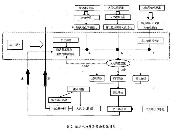 从经济学角度,组织人力资源配置存在需求与供给的矛盾,即组织需求与个人供给的矛盾。需求与供给的均衡状态才是组织人力资源配置的最优状态。而均衡是相对的,组织的人力资源不可能一直保持在一个最优配置的状态,需要通过调整,以达到新的均衡状态,而因此产生的配置水平的提高也意味着更高层次的效率产出。从管理学角度,组织人力资源配置的动态模型应该是一个完备而闭合的管理循环系统,如此一来才可以使组织人力资源配置产生螺旋式的动态优化态势。同时,组织人力资源配置并不是一个独立存在的,它是贯穿于组织人力资源配置始终的,是起点、初衷,也是终点、结果。因此组织人力资源管理的其他模块必然与之发生密切关系,并且决定它的最终效果。以往对于人力资源配置动态模型的构建,实际上只是将“动态配置”的概念生硬的连接到静态配置模型之中,仍然没有逃脱一种单向的过程性描述,也没有对于动态配置本身的机理进行阐述和分析。本文构建的组织人力资源配置的动态模型意在对组织人力资源动态配置的诱因和循环过程,及其与人力资源管理相应关节的关系进行深入的剖析,并在此基础上讨论模型的科学应用。在时间的纬度上,组织人力资源配置系统的外部环境、内部成份都会发生变化,岗位需求变动及个人能级会也随着时间的推移而发生变动。如图2所示a,b、C三个结点分别代表人一岗匹配、人一人匹配以及人一组织匹配。箭头A表示由于员工供_给的变化,即员工能级的变化导致的再配置过程,箭头B代表由于组织需求,即岗位能力需求与人员机构需求所导致的再配置过程。
