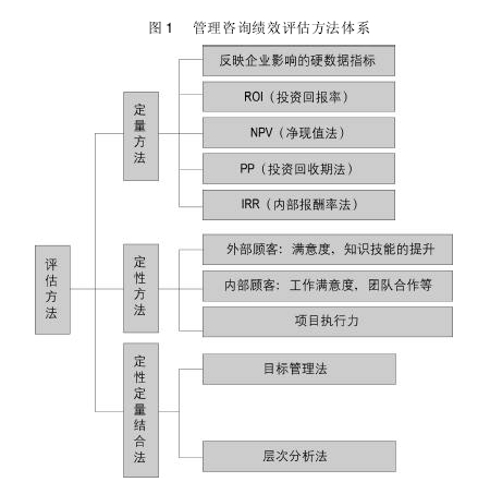 咨询绩效评估是咨询工作的重要组成部分,并且起着不可替代的作用;制定绩效评估分析程序来维持自身的行业竞争力或者赢得行业的领先地位,是咨询公司处于竞争前列的最佳途径。但咨询公司的组织结构、人员结构以及咨询工作的性质决定了咨询绩效评估方法与一般的企业绩效评估、人力资源绩效评估采取的方法有所不同。而且,咨询绩效评估的侧重点不同也决定了绩效评估的方法是多种多样的。因此,应该考虑各方面的相关因素,构建适当的评估方法体系对咨询绩效进行评估。绩效评估方法体系构建所关心的是关键成功因素。这些关键成功因素具体表现在评价指标上,有财务方面的,也有非财务方面的。因此,衡量咨询绩效的指标也有财务指标和非财务指标,进而绩效评估方法必然包括定量评估法、定性评估法以及定性与定量相结合的方法(参见图1)。其中,定量法主要包括投资回报率、净现值法、内部收益率等财务方法;定性法主要包括对外部顾客、内部员工和项目执行力等方面的评估;定性定量结合法则包括目标管理法和层次分析评判法等。