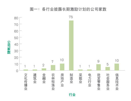 华信惠悦与中国人民大学现代发展研究中心近日联合发布的《2007/2008年度中国高管薪酬及企业治理研究报告》,该报告的研究基于A股1553家上市公司2007年12月31日的最新年报和截至2008年6月30日前公布的公司公告。据报告的统计结果显示,仅有122家公司披露了其长期激励(注1)计划。从所属行业来看,制造业企业有75家,占比超过50%;其次是房地产和信息技术业,两个行业均有10家企业披露了长期激励计划(见图一)。从所属企业性质来看,民营企业有67家,国有控股企业46家,国有企业9家(注2)。