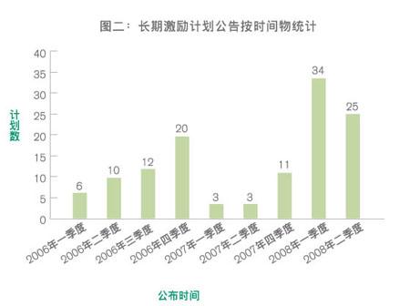 “市场化程度是影响企业是否引入长期激励机制的主要因素之一”,孟楠认为,上市企业所属行业的市场化竞争态势决定了其对绩效的关注程度,像制造业和地产业这些经过了多年市场化运作的行业,代表股东利益的董事会必然会对高管提出相应的业绩要求。而长期激励计划恰恰拉近了作为企业所有者的股东和作为经营者的高管之间的关系,使二者的利益进一步趋同。另据报告显示,实施长期激励一定是未来的趋势所在”。其实,从此次的报告中也能窥见一斑,据报告显示,2008年一、二季度披露长期激励计划数量就有59个,这已相当接近2006年(48个)和2007年(17个)披露的计划的总和(见图二)。孟楠还补充说,当长期激励计划还未成为一种普遍的市场做法时,它可以称得上是一个引才留才的“亮点”。