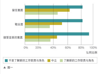 在沟通的部分,令人意外的是,相当高比例的员工表示他们清楚整个企业的变革状况及新的角色与职责。可见现在的企业都能理解良好的沟通对于成功并购的重要性,并具体落实。本调查同时发现,员工清楚了解新的角色与职责,对其敬业度、留任意愿以及接受变革的意愿有极正面的影响,其中,有90%愿意接受变革。相对于不甚了解新角色与职责的员工,只有36%愿意接受变革。此现象也发生在员工的敬业度和留任意愿,有清楚认知员工的认同度远高于不清楚的员工(如图一)。同时不难理解的是,被并购企业的员工对自己新的工作角色与职责有清楚了解的比例是最低的。