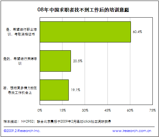 首先,针对求职者需求提供增值服务。调研数据显示,中国求职者在一定时间找不到工作以后,接受培训的愿望更加强烈。其中有60.4%的求职者希望通过职业培训、考取相应的证书来提升职场求职的砝码,有20.5%的求职者希望进行英语培训增强“软实力”,仅有19.1%的求职者不愿意接受培训。艾瑞咨询据此建议招聘网站与有实力的培训机构进行合作或者开发自有的职业培训课程以满足求职者的需求。