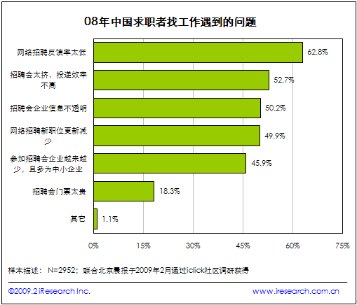 其次,虚假招聘信息破坏了网络招聘市场的诚信体系。目前包括皮包公司以招聘为名进行传销、诈骗等非法活动以及正规公司提供的无效信息(过期或者借助招聘广告进行宣传)等虚假招聘信息严重影响了招聘市场的诚信体系。艾瑞咨询建议招聘网站可以学习淘宝和支付宝的做法,从简单的市场信息传递的角色进入到更深层次的市场建设者、管理者、维护者的角色。一方面,加大对招聘企业资格的审核力度,对求职者反映的皮包公司进行严厉的处罚,保护求职者的利益,另一方面,建立信用体系和互评机制,有效推动人力资源市场信用体系建设,对雇主的行为进行有效监督。