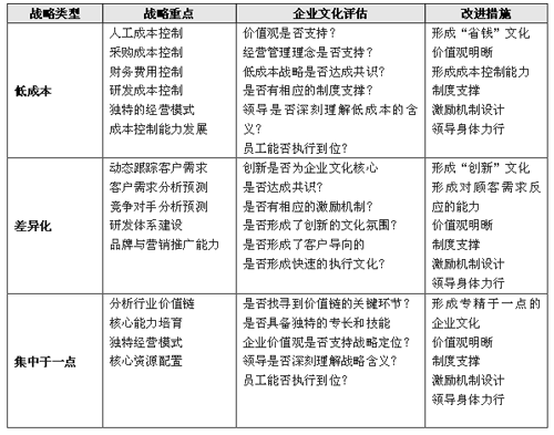 战略方向不外乎三种类型:低成本、差异化和集中于一点。任何公司的战略定位都脱离不了这3个方面。关键的问题是,企业文化如何在战略实施中发挥自己的作用。