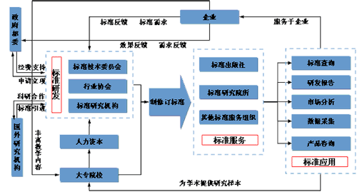 标准化行业的价值链前后端共延伸出四个环节:标准投入、标准研发、标准服务、标准应用。在这个价值链中,最核心的环节就是标准研发环节。通过研发的前后端延伸,形成完整的产业链。