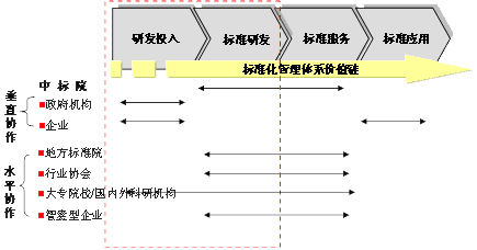 标准研发环节。目前国内处于标准研发环节的机构众多,地方标准研究院与中国标准化研究院等国家标准研究机构,以及行业标准化研究机构(包括:建设部等37个政府部门组织相关机构,发改委授权相关联合会、协会、相关公司,如中国机械工业联合会、中国钢铁工业协会、中国海洋石油总公司等16个单位,国防科工委委托下属大型集团公司,如中国船舶工业总公司、中国兵器工业总公司等)都是标准研发的主体。但标准研发主体各自为政,不能做到有效的资源优势互补,降低了标准研制的效率和水平。