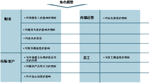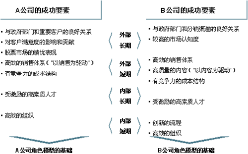 “角色模型”中各指标中的具体内容来源于部门/团队工作的关键成功要素的理解和进一步的分解,为了在组织层面确保项目的成功,角色模型的内容必须与部门/团队工作的成功因素保持一致。这样通过对部门/团队工作关键成功因素的战略性分析,层层分解到与岗位所扮演的角色挂钩,使得角色模型中的指标能衡量职位对企业关键成功要素的贡献程度和重要性(如:关键成功要素:成本领先,角色模型的指标即为:对成本的责任)。