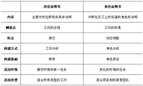 基于上述原因,西方的人力资源工作者提出,应当以角色(作用)分析来代替传统的针对岗位的工作分析,提倡抛弃传统的职位说明书,代之以角色说明书,提倡在进行工作分析和编写说明书的时候,将重点放在角色(作用)上,更加强调结果而非过程。这种从关注“岗位”转变到关注“工作作用”的趋势更加适合研发团队、高层管理团队、销售团队、咨询团队等这种对以团队工作模式而非以个人为基础开展工作的组织。角色说明书与传统的岗位说明书的区别如下。