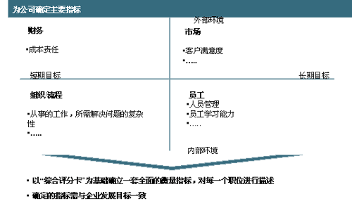 具体的步骤是运用平衡积分卡,结合关键成功因素所确定的一套全面的衡量指标,从四个方面进一步规范化描述职位的角色和定位,在明确职责的基础上,描述清楚不同岗位所侧重实现的角色和要达到的目的。