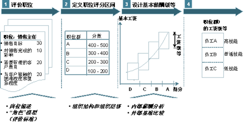 通过对不同项目中职位角色的打分,判定出不同项目类型中,不同职位的相对重要程度,克服了目前不同类型的项目,同一个人所负职责一样,扮演的角色不一样,却拿一样的薪酬,遵守同一薪酬体系的弊端。进而针对不同项目给予扮演不同角色的位置以不同的薪酬等级,保证了薪酬的对内公平性,是对传统基于岗位的薪酬体系和基于能力的薪酬体系一种完善,其步骤如下。