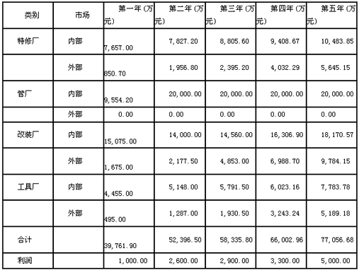 说明:第一年按照15%的销售增长,考虑到整合第一年,需要投入的费用大,利润设定较低:第二年到第四年,处于发展阶段,增长率按照略低于行业增长率20%计,外部市场占总销售额的比例逐步增加,为了投入费用鼓励市场开拓和研发,利润率按5%计:第五年工具类产品销售按增长40%计,其余按20%计,利润率提高到6.5%,整个外部市场的销售比例达到总销售额的30%以上。