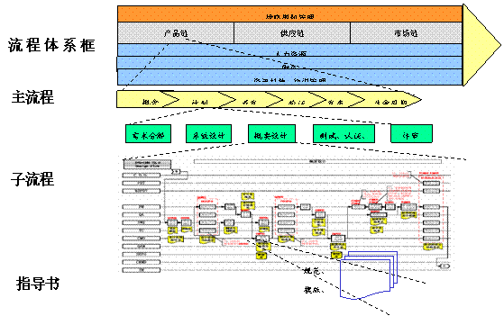 层次化、结构化:体系按价值链进行结构化设计,建立分层分级的流程体系,使得流程之间的逻辑关系(上下游关系、支持关系)明确,如下图。目前相当一部分企业只是在ISO9000质量管理体系方面有层次化的文件体系,而企业层面的流程层次化、结构化并没有建立起来。另一方面,流程之间的逻辑关系只是散见于流程说明中,整个流程体系的逻辑关系(上下游关系、支持关系)并不清晰,这是造成部门间接口不清、相互扯皮的一个重要原因。