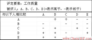 此法要求评定者把所有的被评价者按两两比较的方法,最后把被评价者按绩效高低排列起来。此法容易操作,且结果可靠。因为通常被评价者的姓名都事先准备在一张一张的卡片上,以便每个人与其他所有的人进行一一比较,评定者只需比较出每对被评者中绩效更高的那一个即可。最后,只要把每个被评人在每对比较中绩效更高的次数加起来,就可作为最终排序的基本参数之一。图6给出了对偶比较法的示例。
