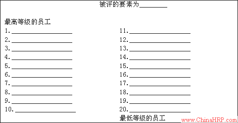 等级排列法是最简单的绩效评定方法之一。此法要求评定者把评价者按某种要素从高到低排列出来。等级排列法常被用来评定总体绩效。其明显的优点是:简单性、强求评定者区分不同水平的绩效。其不足是当被评人数比较多的时候(超过20人),要准确地把他们按等级排列不仅费时费力,而且效果也不一定好。同时,当许多雇员的绩效水平差距较小时,人为地把他们按等级排列反而会引进新的误差。另外,等级排列法不能反映不同等级人员之间的差距大小,跨部门、跨企业的绩效评定就更没有可比较而言了。
