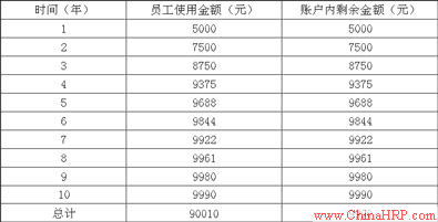 一种情况是,员工甲最初每年的福利项目都不选用,直到第10年(退休前),一次性选择本人账户中全部金额的一半,则一共使用了50000元的福利金;另一种情况是,同样按企业规定,员工乙每年完全使用了账户剩余金额中的50%,则第1年用了5000元(1/2*10000),第2年可用7500元[1/2*(5000+10000)],第3年则可使用8750元[1/2*(7500+10000)]……依此类推,10年间,员工乙共计使用了90010元的福利金。员工乙每年福利的具体使用额和账户剩余额详见下表: